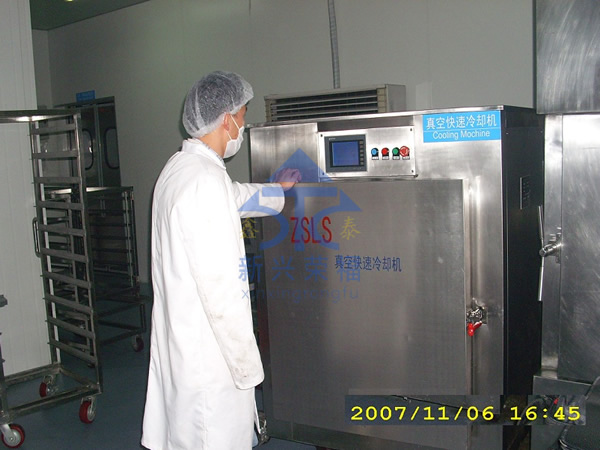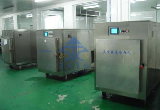由于食品適宜細菌繁殖的溫度帶是 20--65 ℃ 。真空快速冷卻能夠迅速降低熟食品出鍋后的熱量,防止高溫下的食品氧化,同時由于食品在密封的真空環境下快速冷卻,可以避免空氣中細菌再次污染。 從而延長保質期。